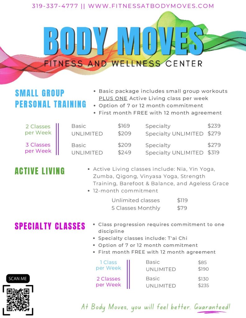 Our Active Living Classes, Specialty Classes, Small Group Personal Training, and Customized Programs are arranged through formal agreements between the student and Body Moves. Monthly tuition payments are done through auto debit with the student’s credit card or debit card. Phone us or email at info@fitnessatbodymoves.com to discuss which options best fit your interests and needs. We have programs for you!
