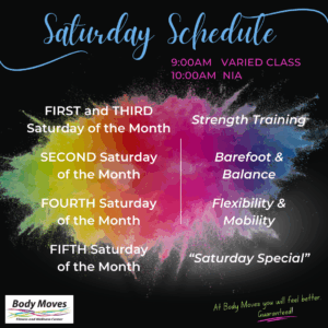 Variety is the spice of life! And at Body Moves, we actively promote varied daily movement and want to encourage it among our students. In light of this and in consideration of our community’s best interest, we’ve decided to vary our Saturday morning class schedule.
